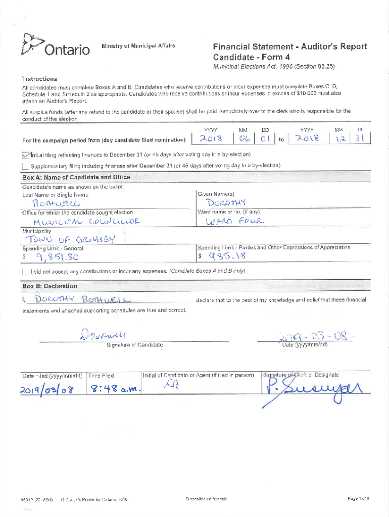 OntarioMinistry of Municipal AffairsFinancial Statement Auditor\'s Report Candidate Form 4 Municipal Elections Act, 1996 (Section 88.25)instructions All candidates must complete Boxes A and B. Candidates