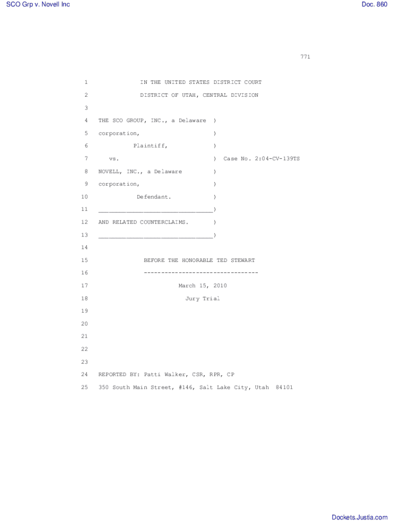 SCO GRP v. Novel Inchon. 8607711IN THE UNITED STATES DISTRICT COURT2DISTRICT OF UTAH, CENTRAL DIVISION3 4THE SCO GROUP, INC., a Delaware)5corporation,)6 7Plaintiff,)vs.)8NOVELL, INC., a Delaware)9corporation,)10Defendant.