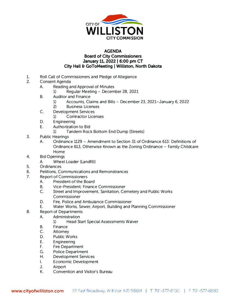 AGENDA Board of City Commissioners January 11, 2022 | 6:00 pm CT City Hall & GoToMeeting | Williston, North Dakota 1. 2.3.4. 5. 6. 7.8. Roll Call of Commissioners and Pledge of Allegiance Consent