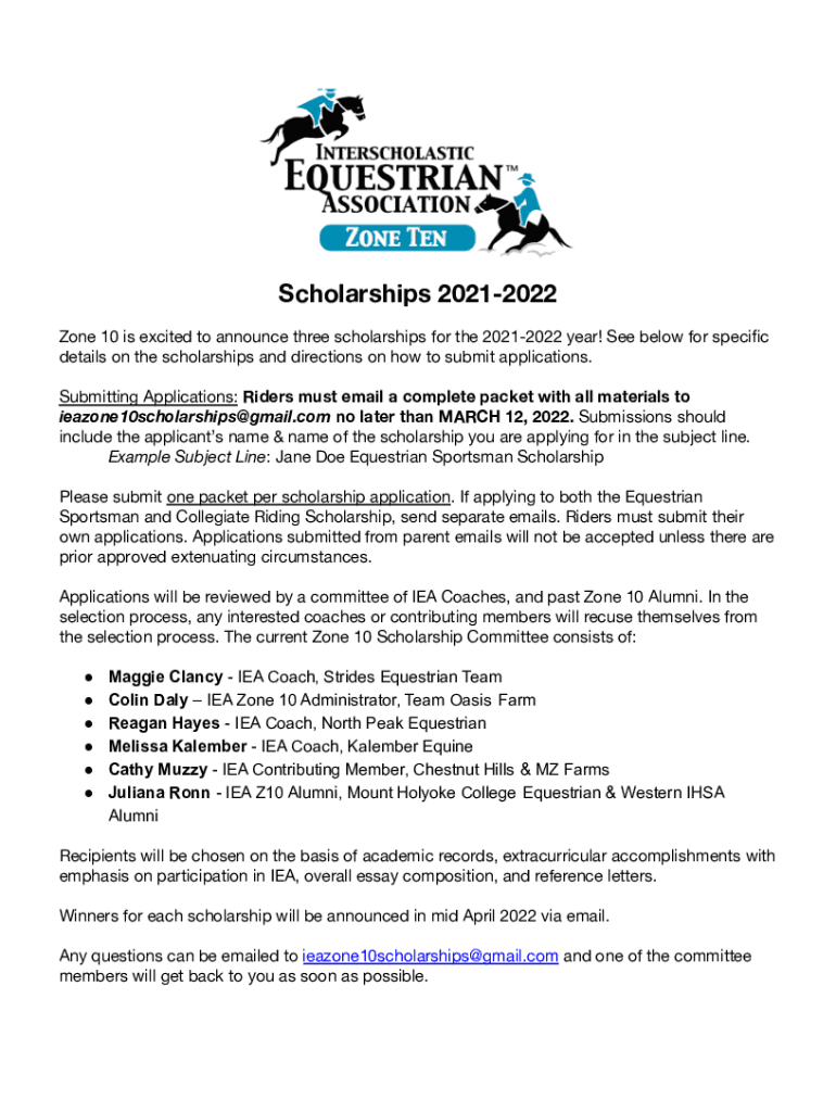 IEA Zone 10 scholarships require athletes to report their personal details, riding achievements, financial need, and any additional information requested in the application form.