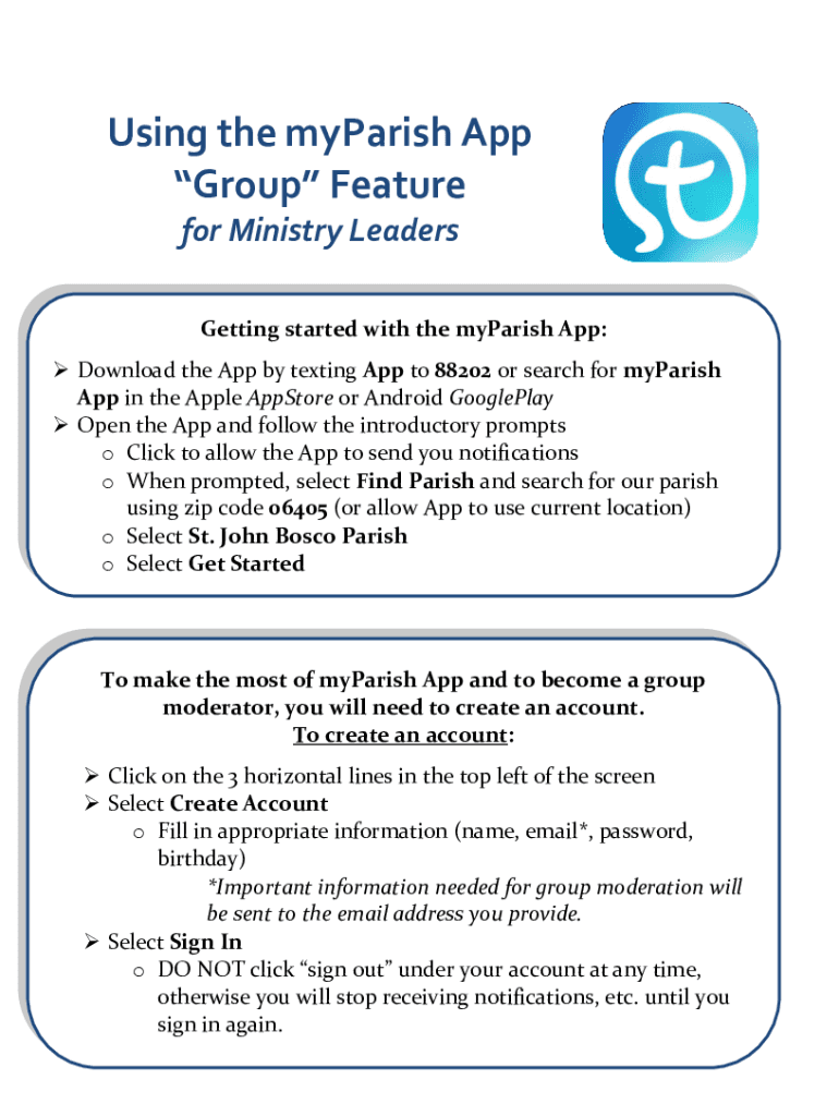 Using the parish App Group Feature for Ministry Leaders Getting started with the parish App: Download the App by texting App to 88202 or search for parish App in the Apple App Store or Android Google