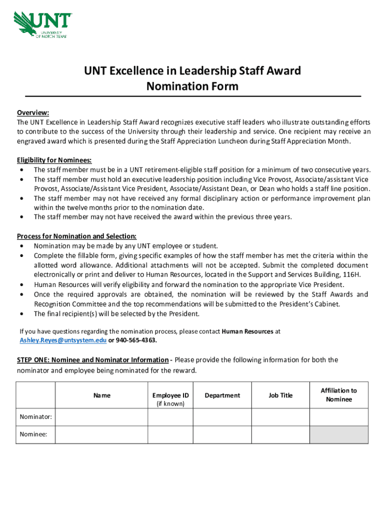 UNT Excellence in Leadership Staff Award Nomination Form Overview: The UNT Excellence in Leadership Staff Award recognizes executive staff leaders who illustrate outstanding efforts to contribute