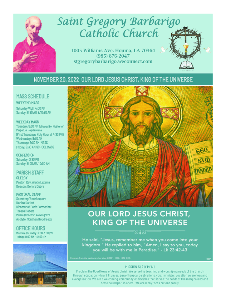 stgregorybarbarigo.reconnect. November 20, 2022, OUR LORD JESUS CHRIST, KING OF THE UNIVERSE