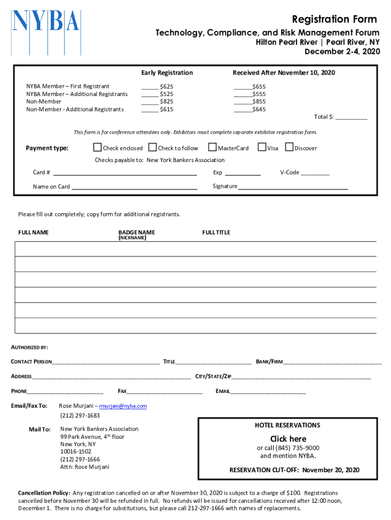 Registration Form Technology, Compliance, and Risk Management Forum Hilton Pearl River | Pearl River, NY December 24, 2020NYBA Member First Registrant NBA Member Additional Registrants Nonmember Additional