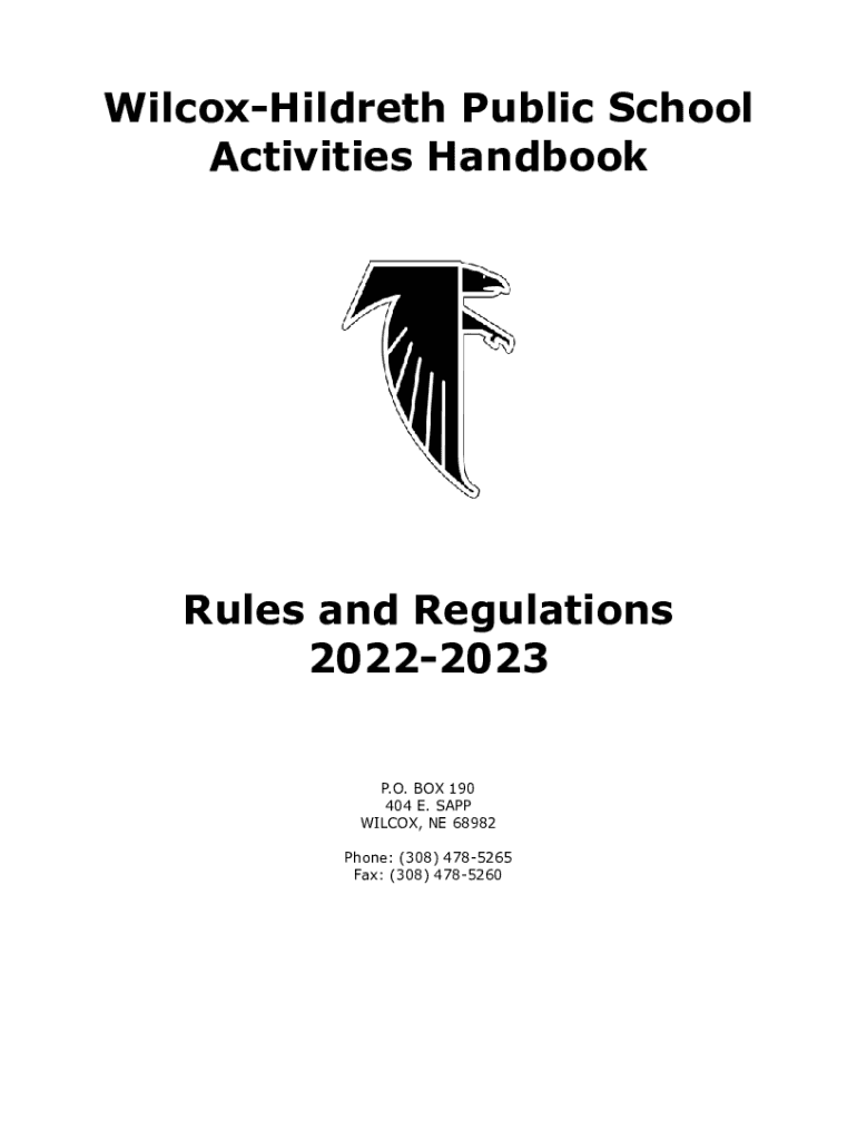 WilcoxHildreth Public School Activities HandbookRules and Regulations 20222023 P.O. BOX 190 404 E. SAP WILCOX, NE 68982 Phone: (308) 4785265 Fax: (308) 4785260Table of Contents Introduction NonDiscriminationSection