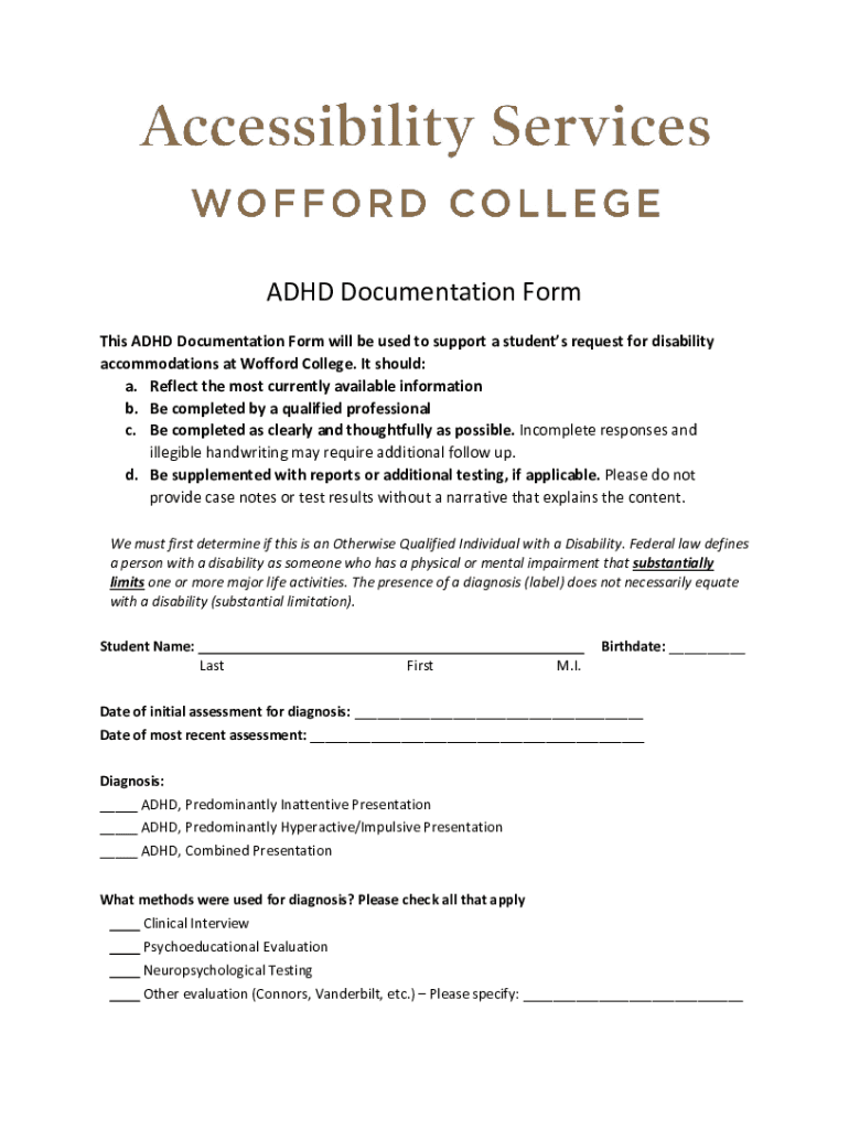 ADHD Documentation Form This ADHD Documentation Form will be used to support a students request for disability accommodations at Oxford College. It should: a. Reflect the most currently available