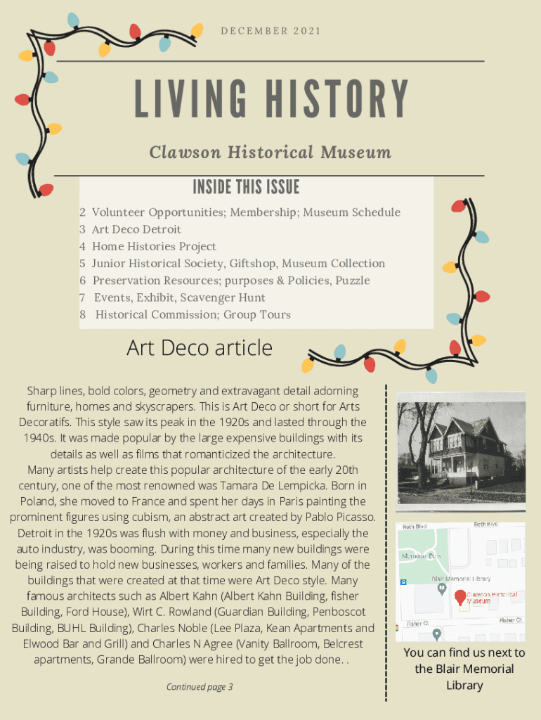 DECEMBER 2021LIVINGHISTORYClawson Historical Museum INSIDE THIS ISSUE2 Volunteer Opportunities; Membership; Museum Schedule 3 Art Deco Detroit 4 Home Histories Project 5 Junior Historical Society,