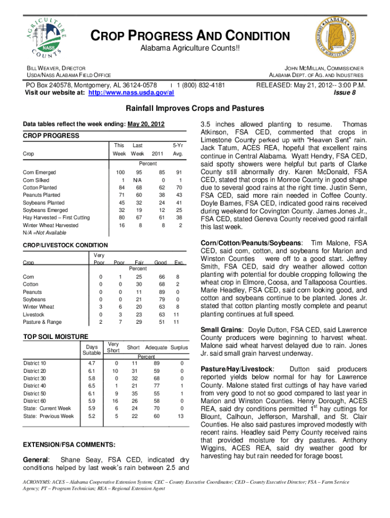 CROP PROGRESS AND CONDITION Alabama Agriculture Counts!! BILL WE AVER, DIRECTOR USDA/MASS ALABAMA FIELD OFFICEJOHN McMillan, COMMISSIONER ALABAMA DEPT. OF AG. AND INDUSTRIES PO Box 240578, Montgomery,