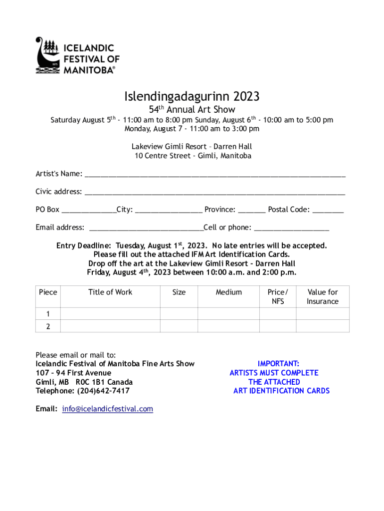 Islendingadagurinn 2023 54th Annual Art Show Saturday, August 5th 11:00 am to 8:00 pm Sunday, August 6th 10:00 am to 5:00 pm Monday, August 7 11:00 am to 3:00 pm Lake view Girl Resort Darren Hall