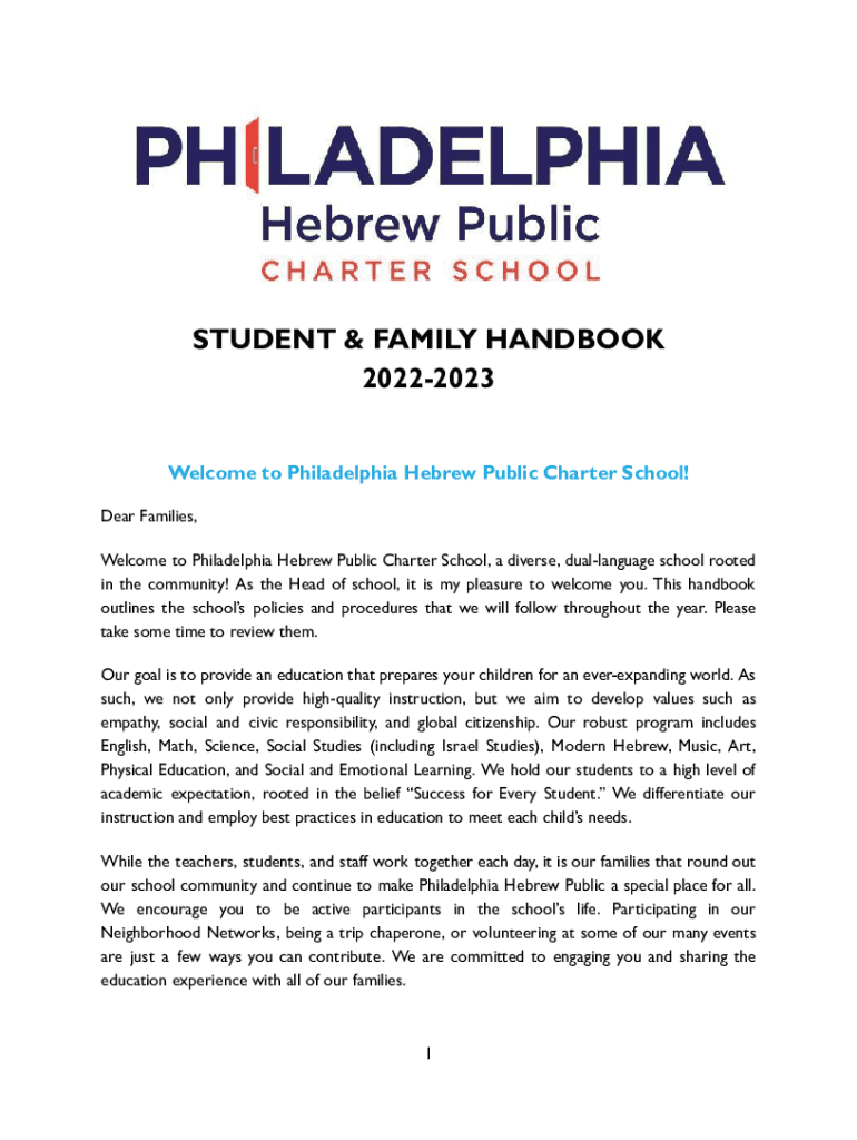 STUDENT & FAMILY HANDBOOK 20222023 Welcome to Philadelphia Hebrew Public Charter School! Dear Families, Welcome to Philadelphia Hebrew Public Charter School, a diverse, dual language school rooted