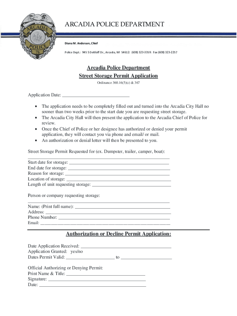 Page |1ARCADIA POLICE DEPARTMENT Diana M. Anderson, Chief Police Dept.: 945 S Meatloaf Dr., Arcadia, WI 54612: (608) 3233359: Fax (608) 3232257Arcadia Police Department Street Storage Permit Application