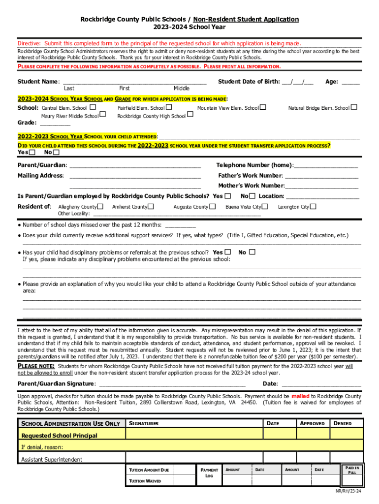 Rock bridge County Public Schools / Nonresident Student Application 20232024 School Year Directive: Submit this completed form to the principal of the requested school for which application is being