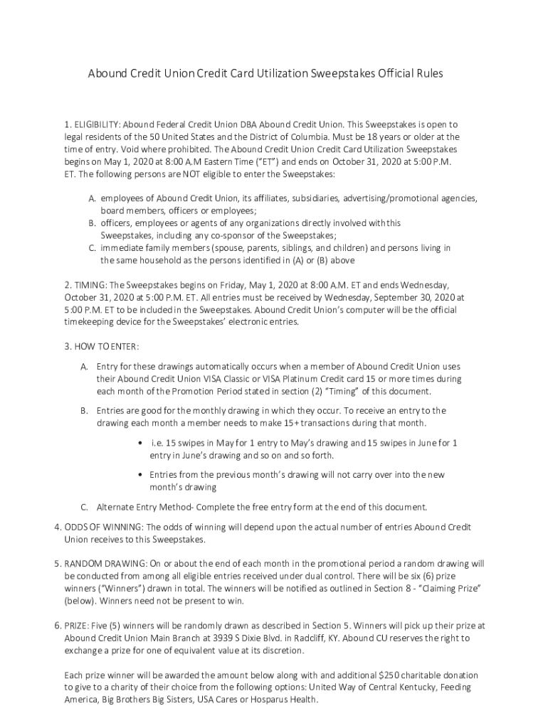 Abound Credit Union Credit Card Utilization Sweepstakes Official Rules1. ELIGIBILITY: Abound Federal Credit Union DBA Abound Credit Union. These Sweepstakes are open to legal residents of the 50 United
