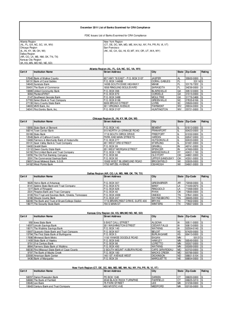 December 2011 List of Banks Examined for CRA Compliance FDIC Issues List of Banks Examined for CRA Compliance Atlanta Region (AL, FL, GA, NC, SC, VA, WV) Chicago Region (IL, IN, KY, MI, OH, WI) Dallas