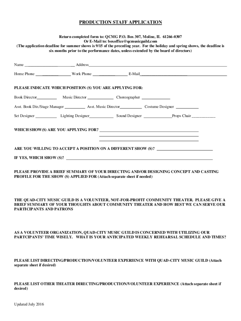PRODUCTION STAFF APPLICATION Return completed form to: CMG P.O. Box 307, Molina, IL 612660307 Or Email to: boxoffice@qcmusicguild.com (The application deadline for summer shows is 9/15 of the preceding