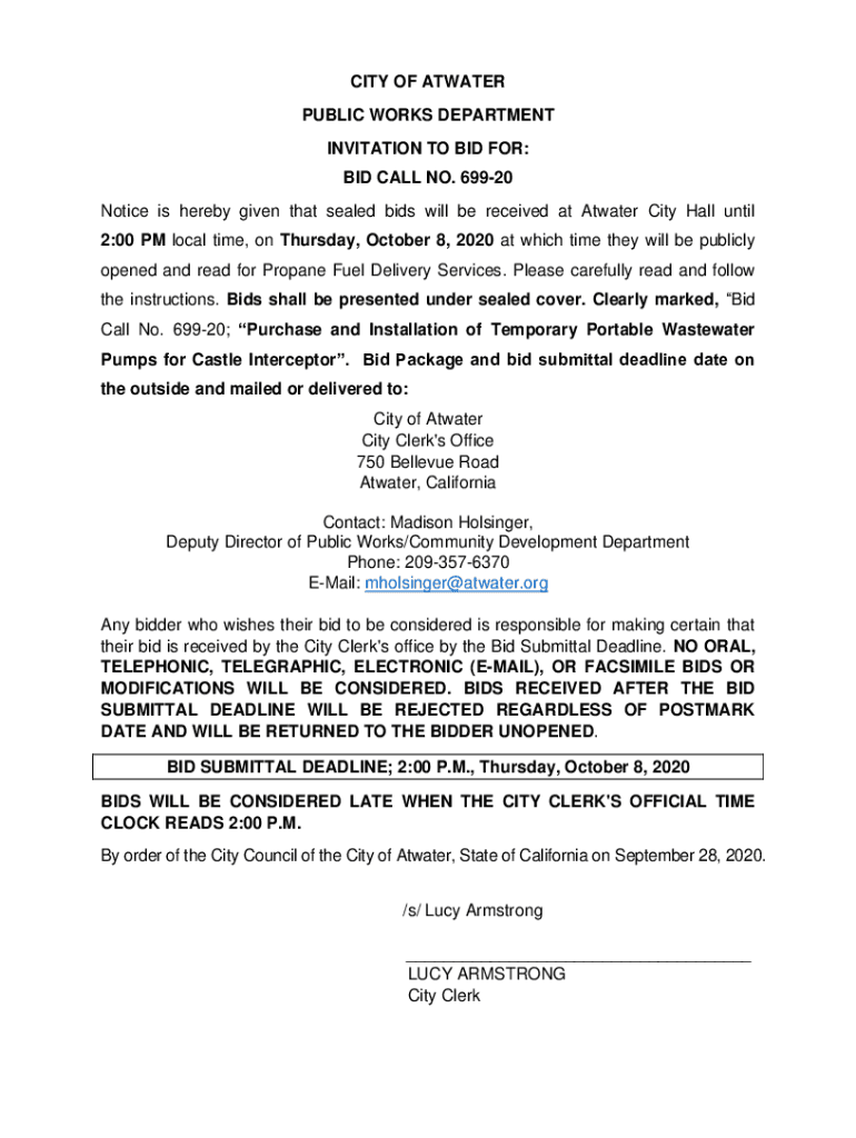 CITY OF ATW ATER PUBLIC WORKS DEPARTMENT INVITATION TO BID FOR: BID CALL NO. 69920 Notice is hereby given that sealed bids will be received at water City Hall until 2:00 PM local time, on Thursday,