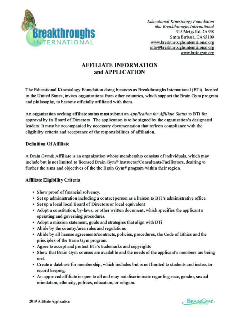 Educational Kinesiology Foundation DBA Breakthroughs International 315 Mags Rd, #A338 Santa Barbara, CA 93109 www.breakthroughsinternational.org info@breakthroughsinternational.org www.braingym.orgAFFILIATE