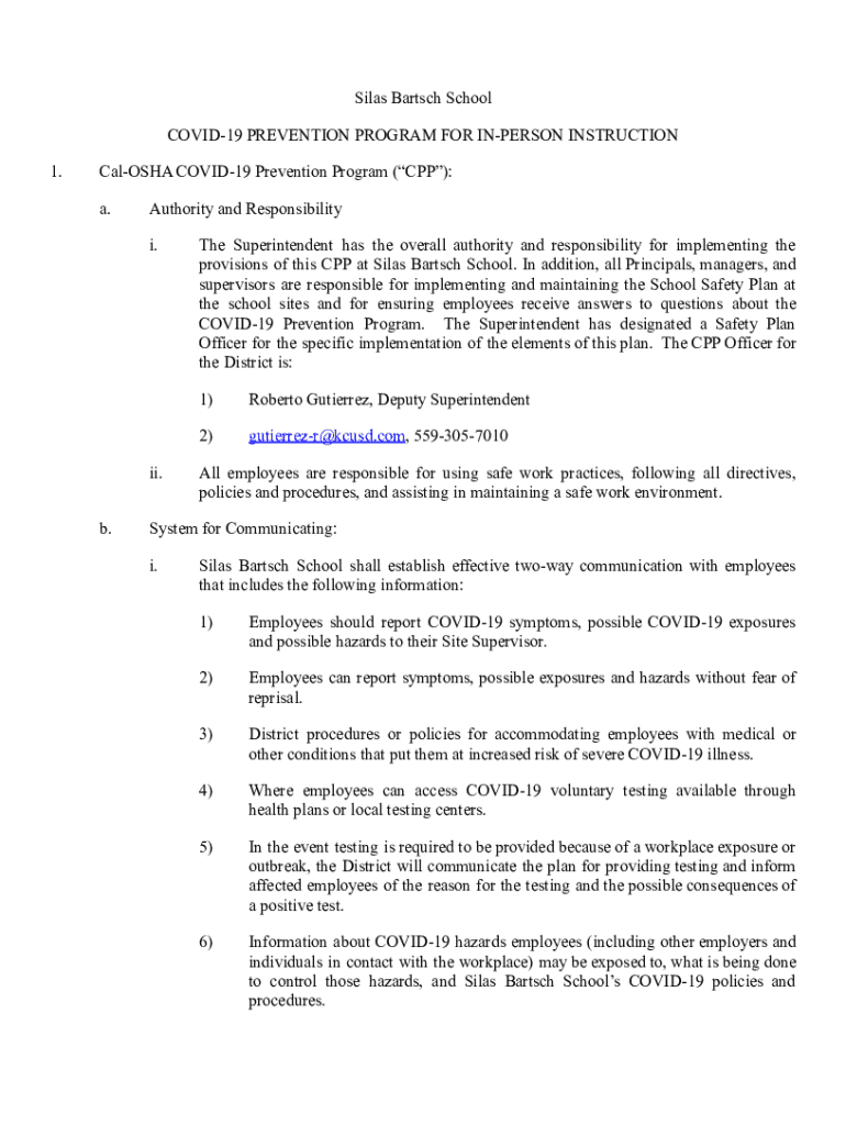 Silas Bart sch School COVID-19 PREVENTION PROGRAM FOR UNPERSON INSTRUCTION 1. Cal OSHA COVID-19 Prevention Program (CPP): a. Authority and Responsibility i.ii. b. The Superintendent has the overall