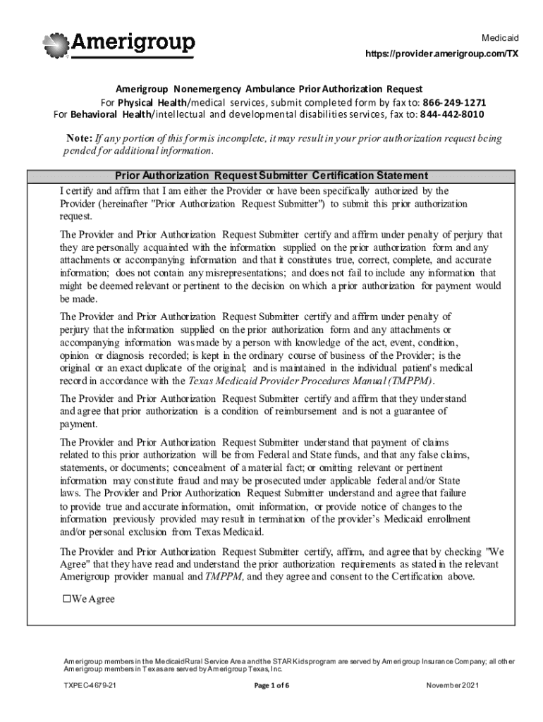Medicaid https://provider.amerigroup.com/TXAmerigroup Nonemergency Ambulance Prior Authorization Request For Physical Health/medical services, submit completed form by fax to: 8662491271 For Behavioral