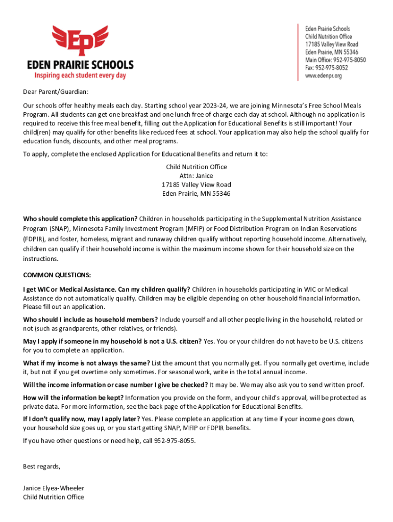 Dear Parent/Guardian: Our schools offer healthy meals each day. Starting school year 202324, we are joining Minnesota's Free School Meals Program. All students can get one breakfast and one lunch