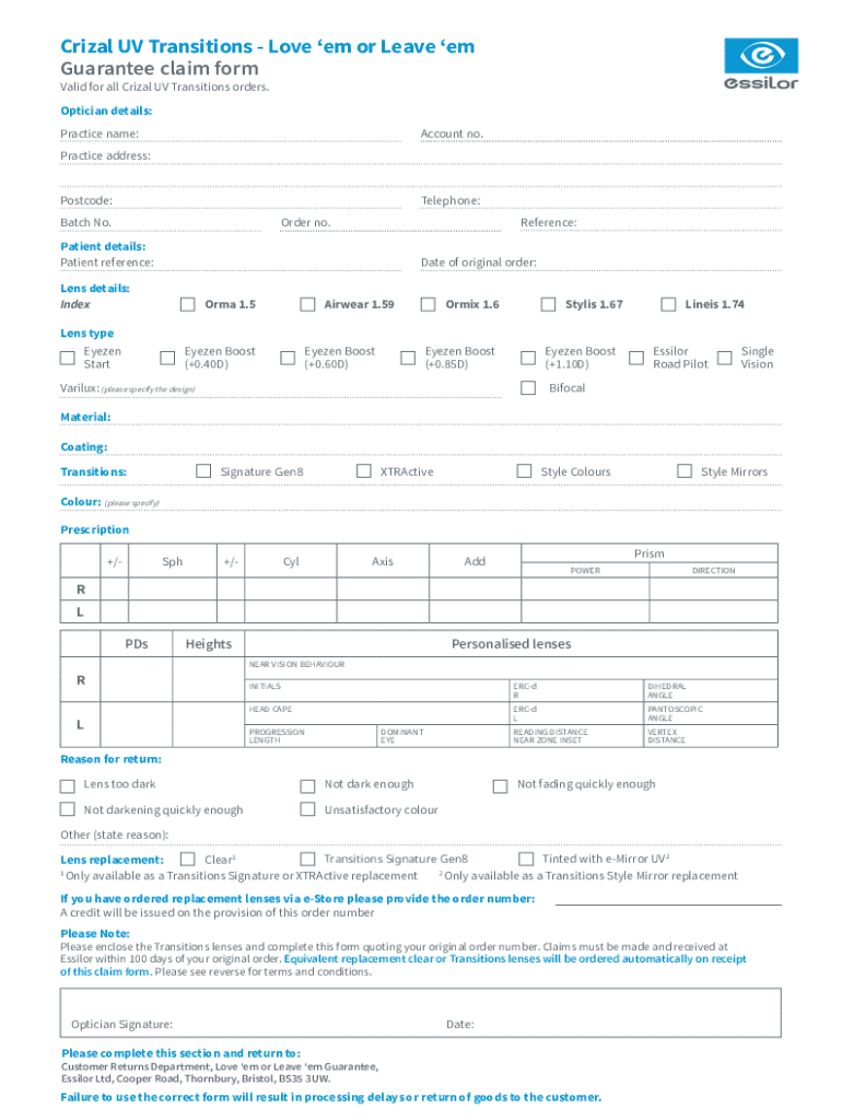 Rizal UV Transitions Love em or Leave em Guarantee claim form Valid for all Rizal UV Transitions orders. Optician details: Practice name:Account no. Practice address: Postcode:Telephone:Batch No.