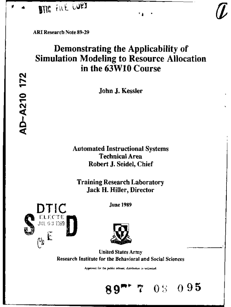 ARI Research Note 8929NDemonstrating the Applicability of Simulation Modeling to Resource Allocation in the 63W10 Course John J. KesslerAutomated Instructional Systems Technical Area Robert J. Sade,