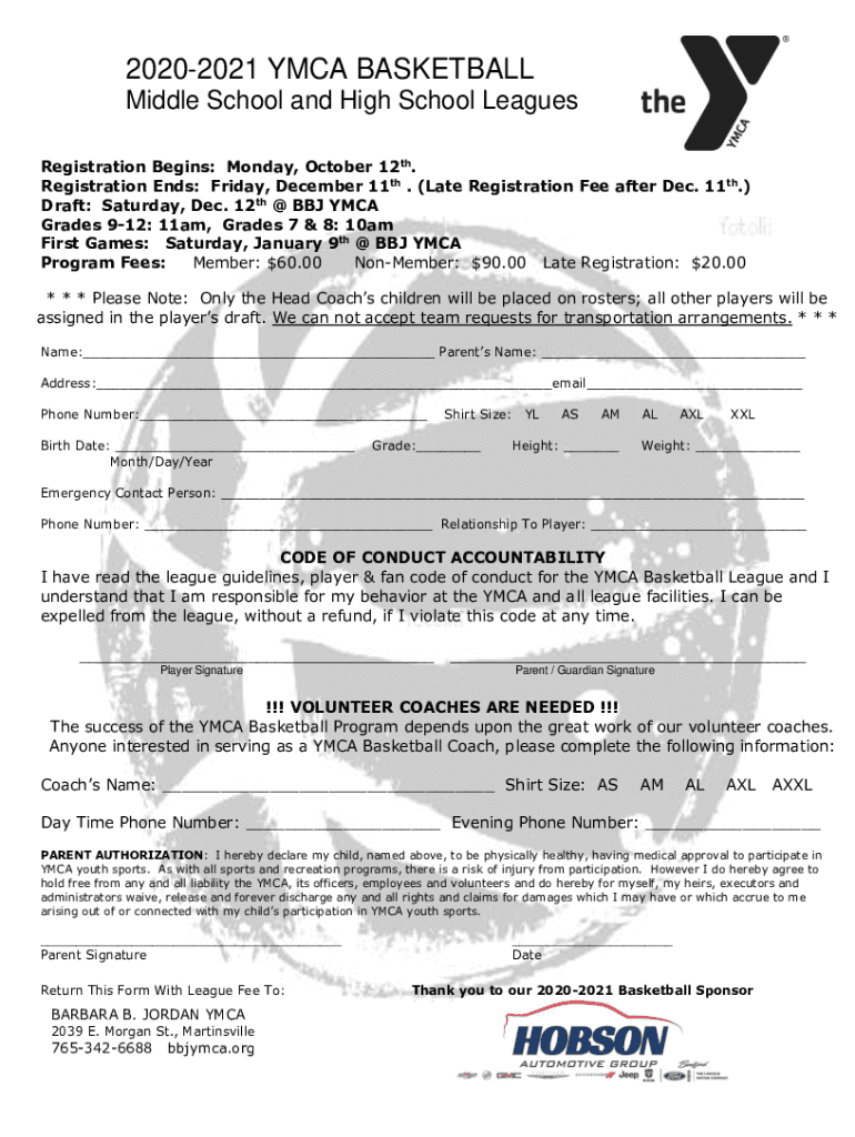 20202021 YMCA BASKETBALL Middle School and High School Leagues. Registration Begins: Monday, October 12. Registration Ends: Friday, December 11th. (Late Registration Fee after Dec. 11th.) Draft: Saturday,