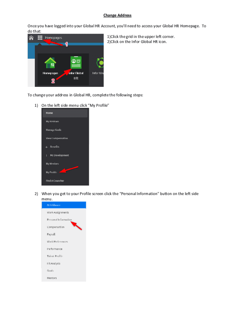 Change Address Once you have logged into your Global HR Account, you'll need to access your Global HR Homepage. To do that: 1)Click the grid in the upper left corner. 2)Click on the Inform Global