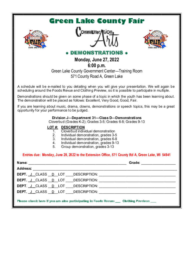 Green Lake County Fair DEMONSTRATIONS Monday, June 27, 2022 6:00 p.m. Green Lake County Government Entertaining Room 571 County Road A, Green Lake A schedule will be emailed to you detailing when