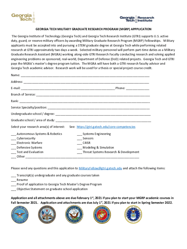GEORGIA TECH MILITARY GRADUATE RESEARCH PROGRAM (GRP) APPLICATION The Georgia Institute of Technology (Georgia Tech) and Georgia Tech Research Institute (GRI) supports U.S. active duty, guard, or
