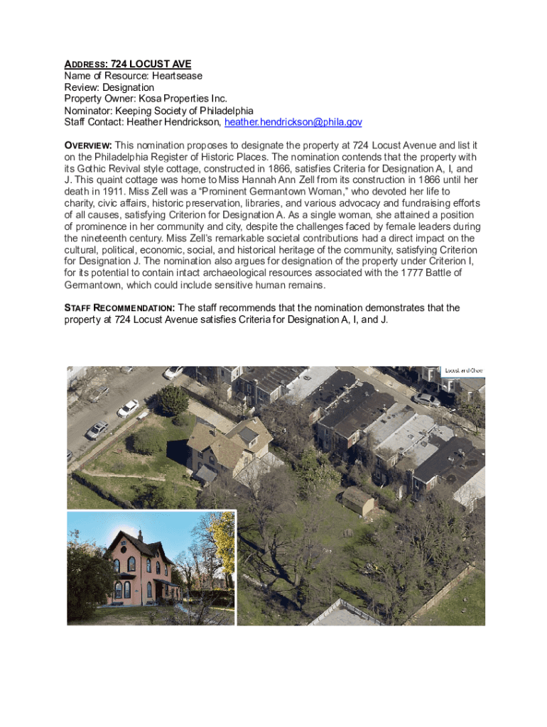 ADDRESS: 724 LOCUST AVE Name of Resource: Hearts ease Review: Designation Property Owner: Rosa Properties Inc. Nominator: Keeping Society of Philadelphia Staff Contact: Heather Hendrickson, heather.hendrickson@phila.gov