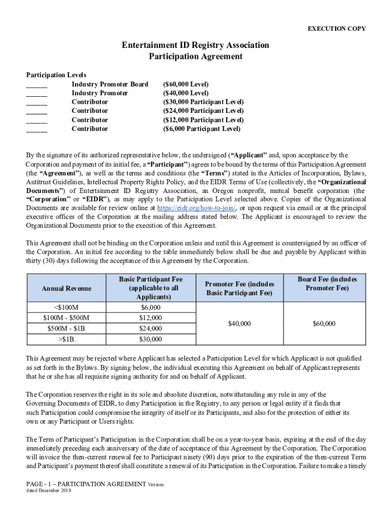 EXECUTION COPYEntertainment ID Registry Association Participation Agreement Participation Levels ___ Industry Promoter Board ___ Industry Promoter ___ Contributor ___ Contributor ___ Contributor ___