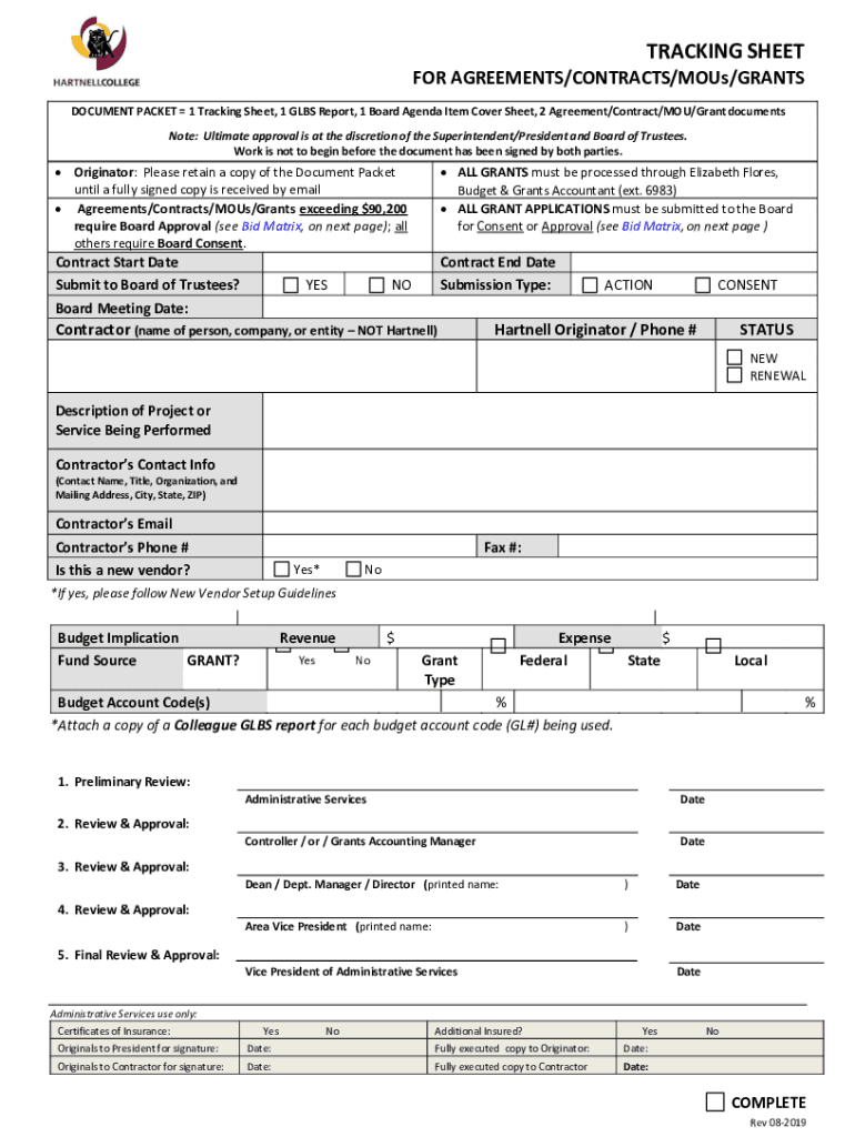 TRACKING SHEET FOR AGREEMENTS/CONTRACTS/Mouse/GRANTS DOCUMENT PACKET 1 Tracking Sheet, 1 LBS Report, 1 Board Agenda Item Cover Sheet, 2 Agreement/Contract/YOU/Grant documents Note: Ultimate approval