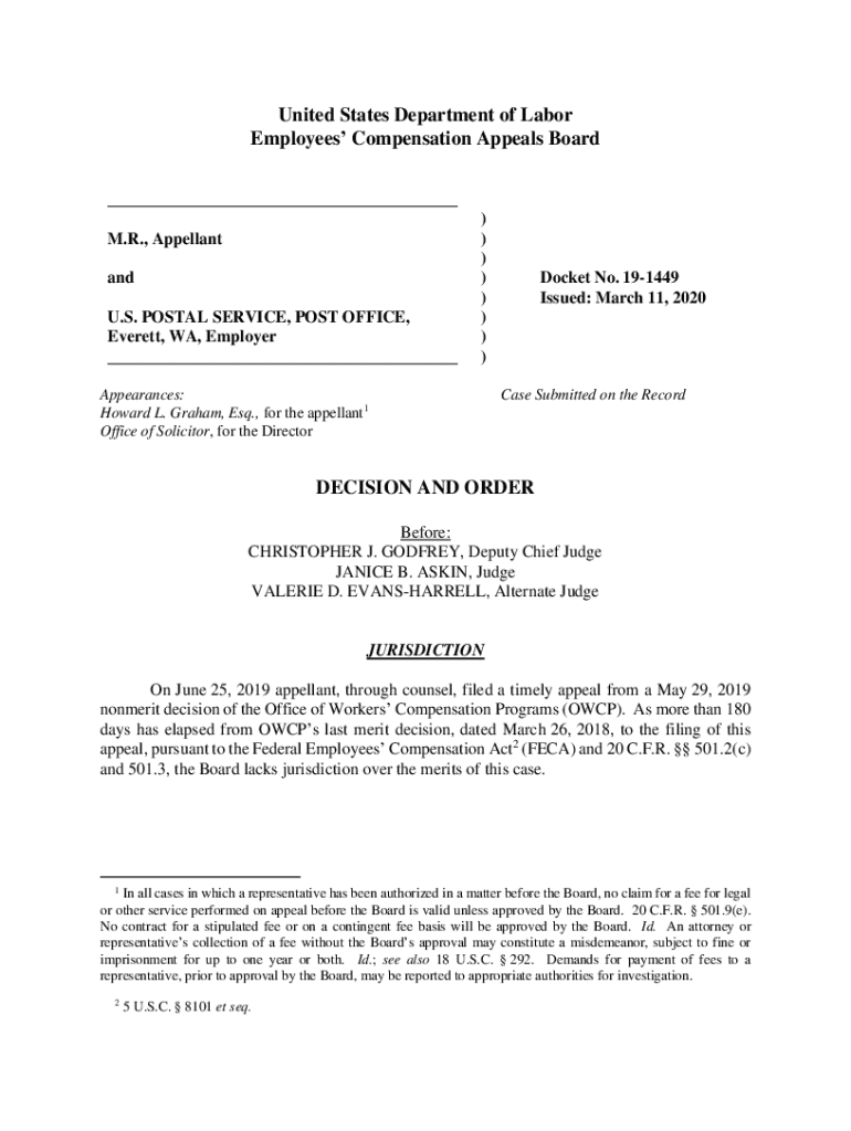 United States Department of Labor Employees Compensation Appeals Board ___ M.R., Appellant and U.S. POSTAL SERVICE, POST OFFICE, Everett, WA, Employer ___))))))))Appearances: Howard L. Graham, Esq.,