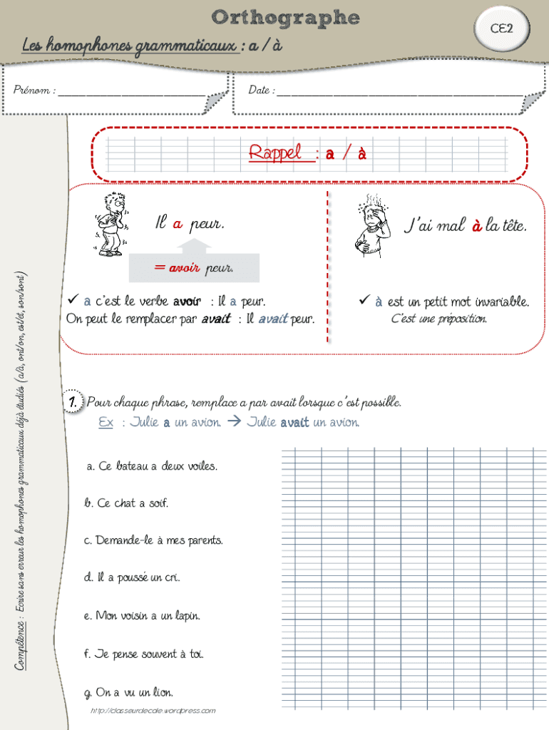 Les homophones grammaticaux worksheet sont des documents éducatifs utilisés pour enseigner et pratiquer l'utilisation correcte des homophones en français, c'est-à-dire des mots qui se prononcent de la même manière mais qui ont des significations différentes.