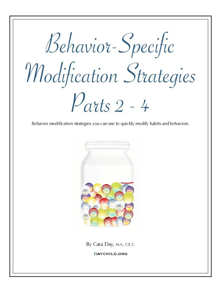 BehaviorSpecific Modification Strategies Parts 2 4 Behavior modification strategies you can use to quickly modify habits and behaviors. By Cara Day, M.A., C.E.C. Day child.orgBehaviorSpecific Modification