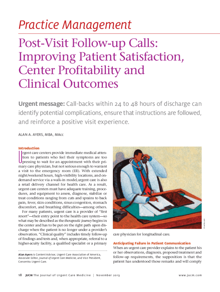 Practice Management Positivist Followup Calls: Improving Patient Satisfaction, Center Profitability and Clinical Outcomes Urgent message: Callbacks within 24 to 48 hours of discharge can identify