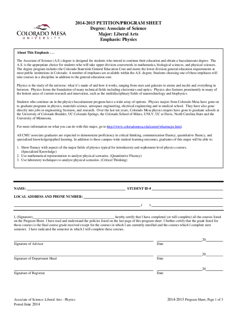 20142015 PETITION/PROGRAM SHEET Degree: Associate of Science Major: Liberal Arts Emphasis: Physics About This Emphasis. . . The Associate of Science (A.S.) degree is designed for students who intend