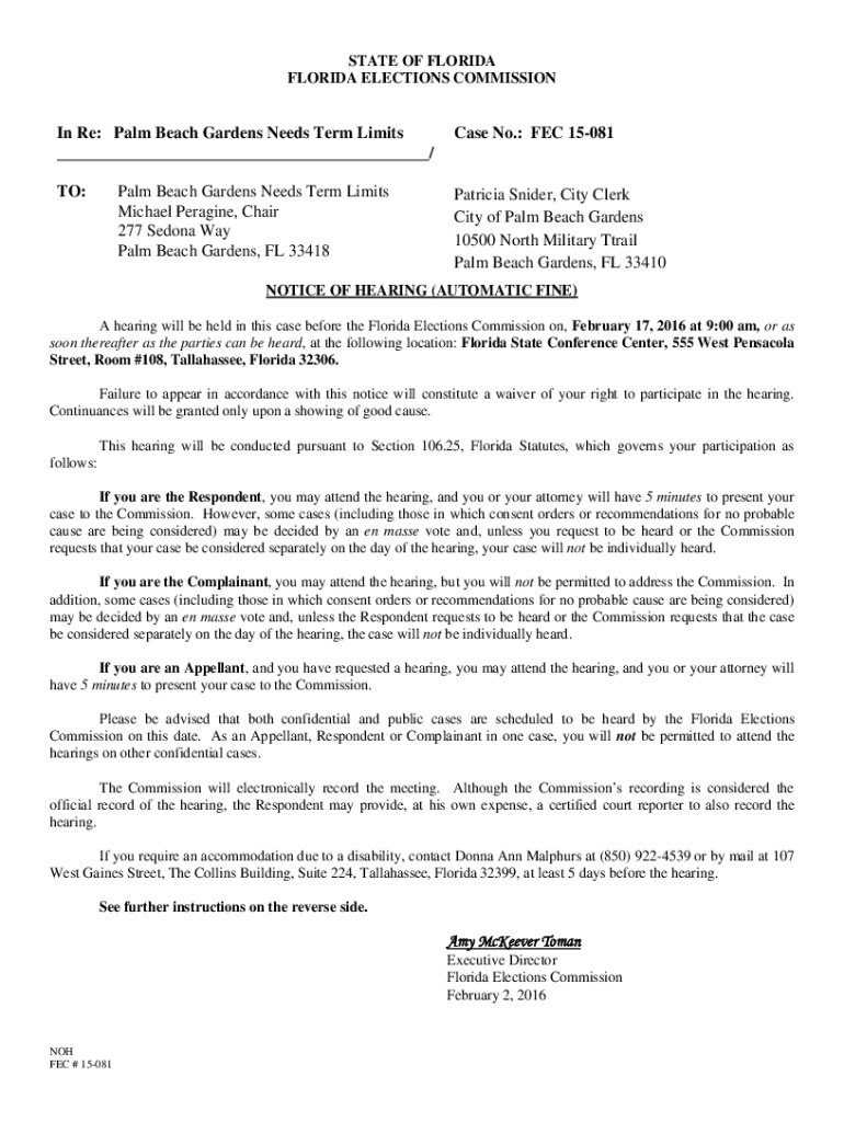 STATE OF FLORIDA ELECTIONS Commissioning Re: Palm Beach Gardens Needs Term Limits ___/Case No.: FEC 15081TO:Patricia Snider, City Clerk City of Palm Beach Gardens 10500 North Military Trail Palm Beach