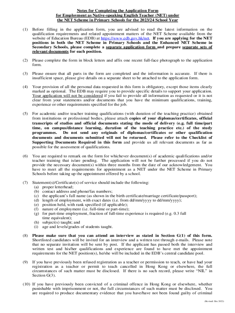 Notes for Completing the Application Form for Employment as Native speaking English Teacher (NET) under the NET Scheme in Primary Schools for the 2023/24 School Year (1)Before filling in the application