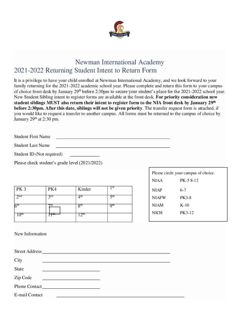 Newman International Academy 20212022 Returning Student Intent to Return Form It is a privilege to have your child enrolled at Newman International Academy, and we look forward to your family returning