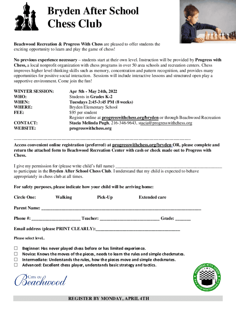 Dryden After Schoolchild Club Beachwood Recreation & Progress With Chess are pleased to offer students the exciting opportunity to learn and play the game of chess! No previous experience necessary