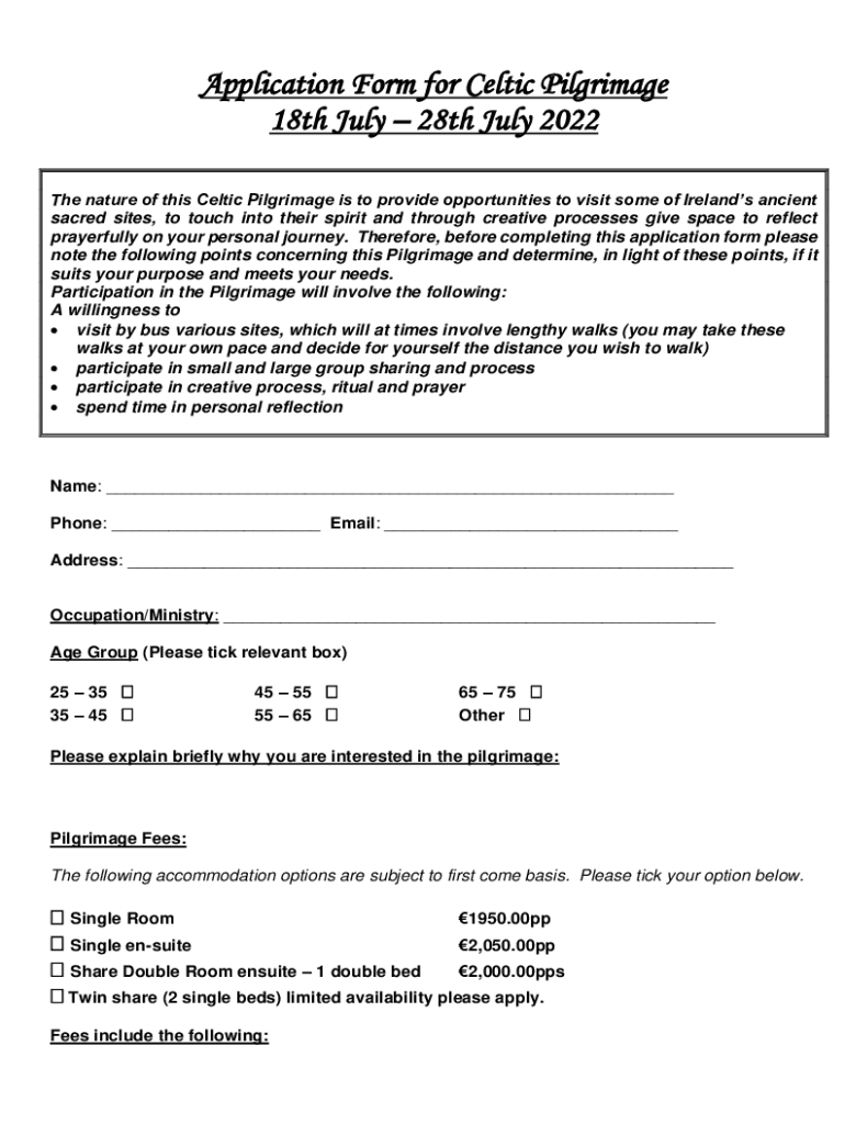 Application Form for Celtic Pilgrimage 18th July 28th July 2022 The nature of this Celtic Pilgrimage is to provide opportunities to visit some of Ireland's ancient sacred sites, to touch into their