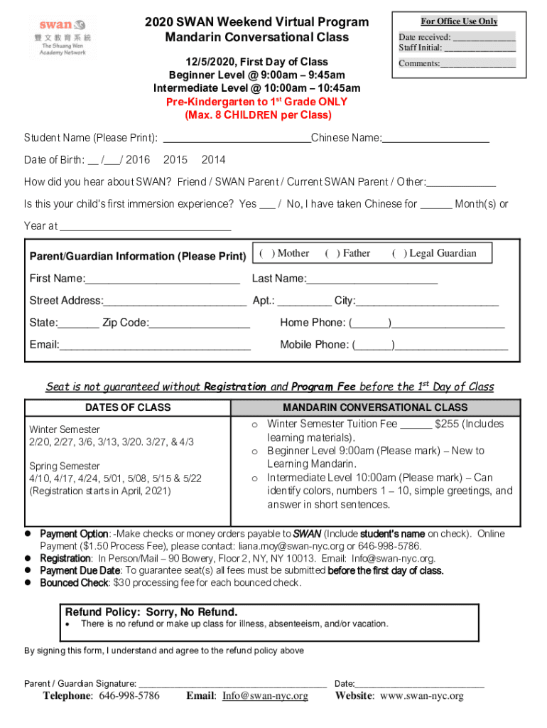2020 SWAN Weekend Virtual Program Mandarin Conversational Class 12/5/2020, First Day of Class Beginner Level @ 9:00am 9:45am Intermediate Level @ 10:00am 10:45am PreKindergarten to 1st Grade ONLY