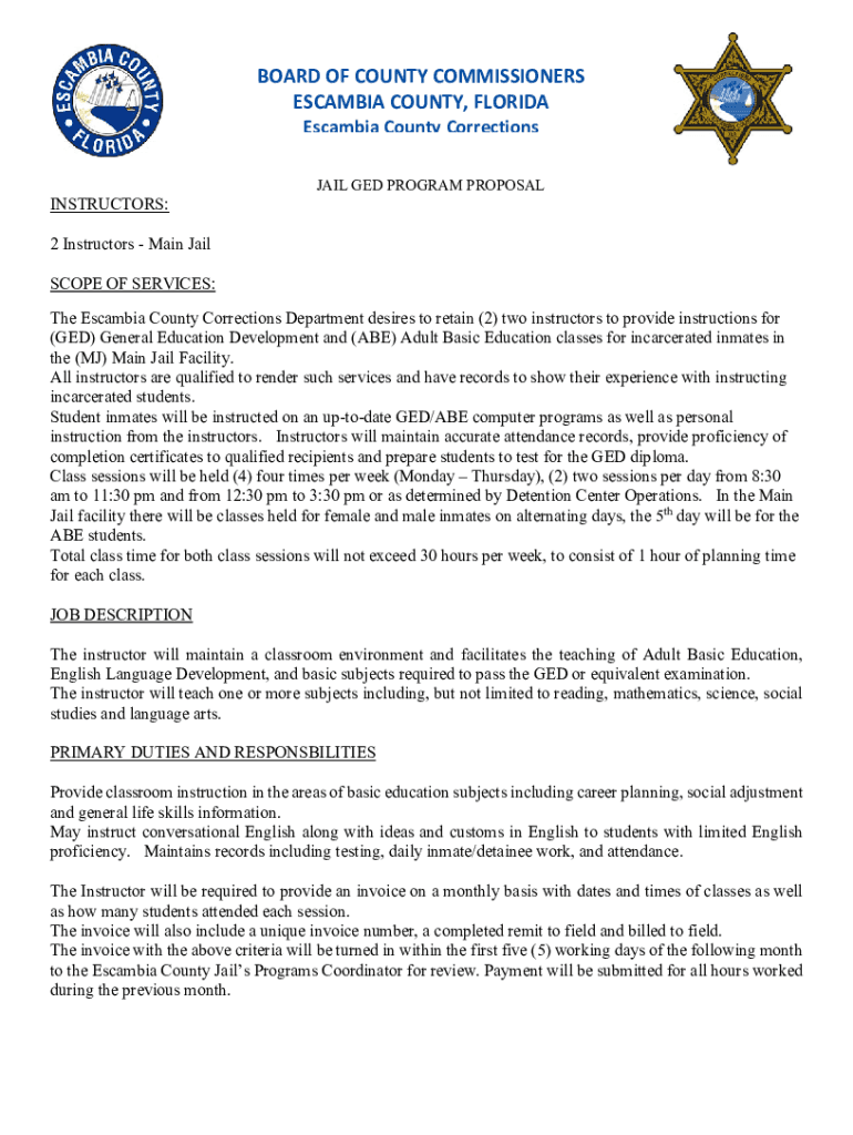 BOARDOFCOUNTYCOMMISSIONERS ESCAMBIACOUNTY, FLORIDA Escambia County Corrections INSTRUCTORS: JAIL GED PROGRAM PROPOSAL2 Instructors Main Jail SCOPE OF SERVICES: The Escambia County Corrections Department