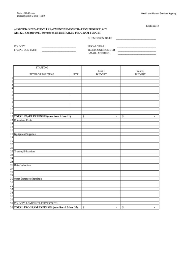State of California Department of Mental HealthHealth and Human Services AgencyEnclosure 2 ASSISTED OUTPATIENT TREATMENT DEMONSTRATION PROJECT ACT AB 1421, Chapter 1017, Statutes of 2002 DETAILED