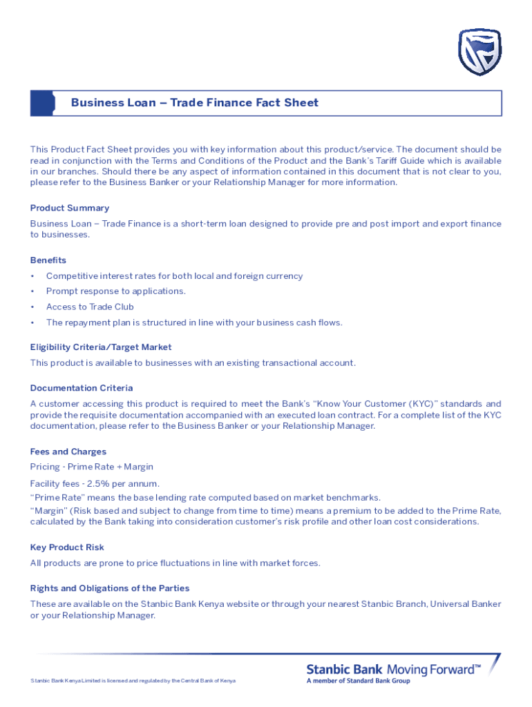 Business Loan Trade Finance Fact Sheets Product Fact Sheet provides you with key information about this product/service. The document should be read in conjunction with the Terms and Conditions of