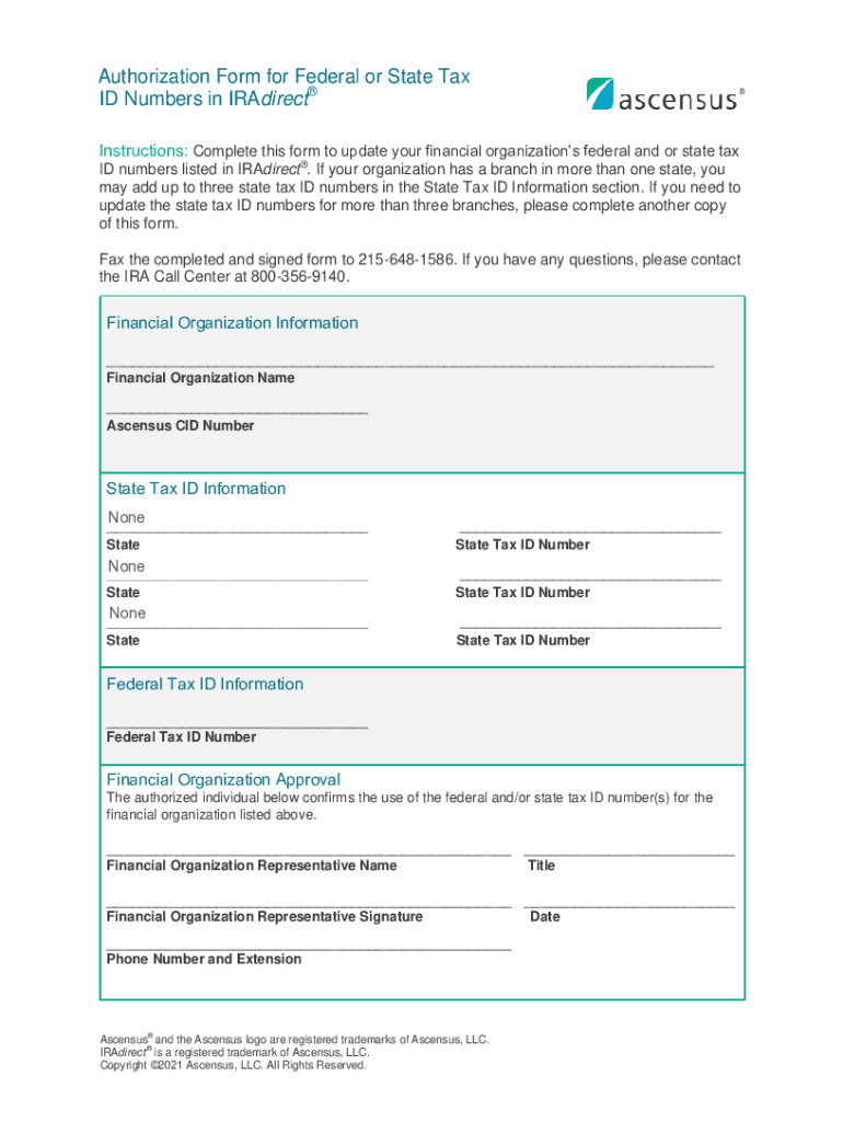Authorization Form for Federal or State Tax ID Numbers in IRA direct Instructions: Complete this form to update your financial organizations federal and or state taxi numbers listed in IRA direct.