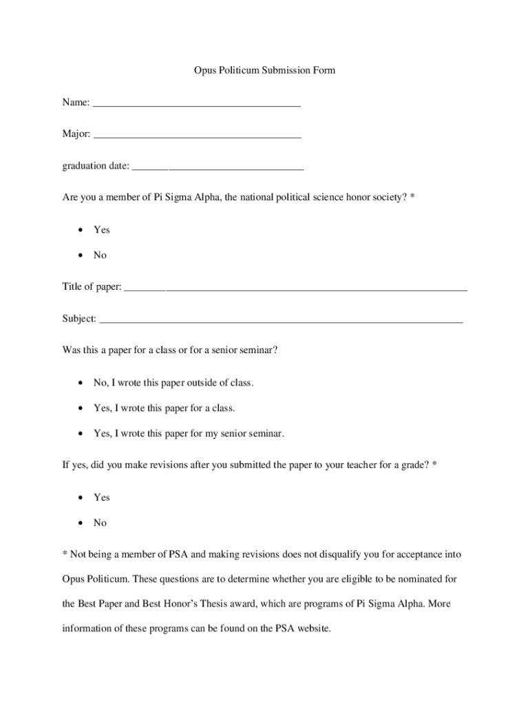 Opus Politicum Submission Form Name: ___ Major: ___ graduation date: ___ Are you a member of Pi Sigma Alpha, the national political science honor society? * Entitle of paper: ___ Subject: ___ Was