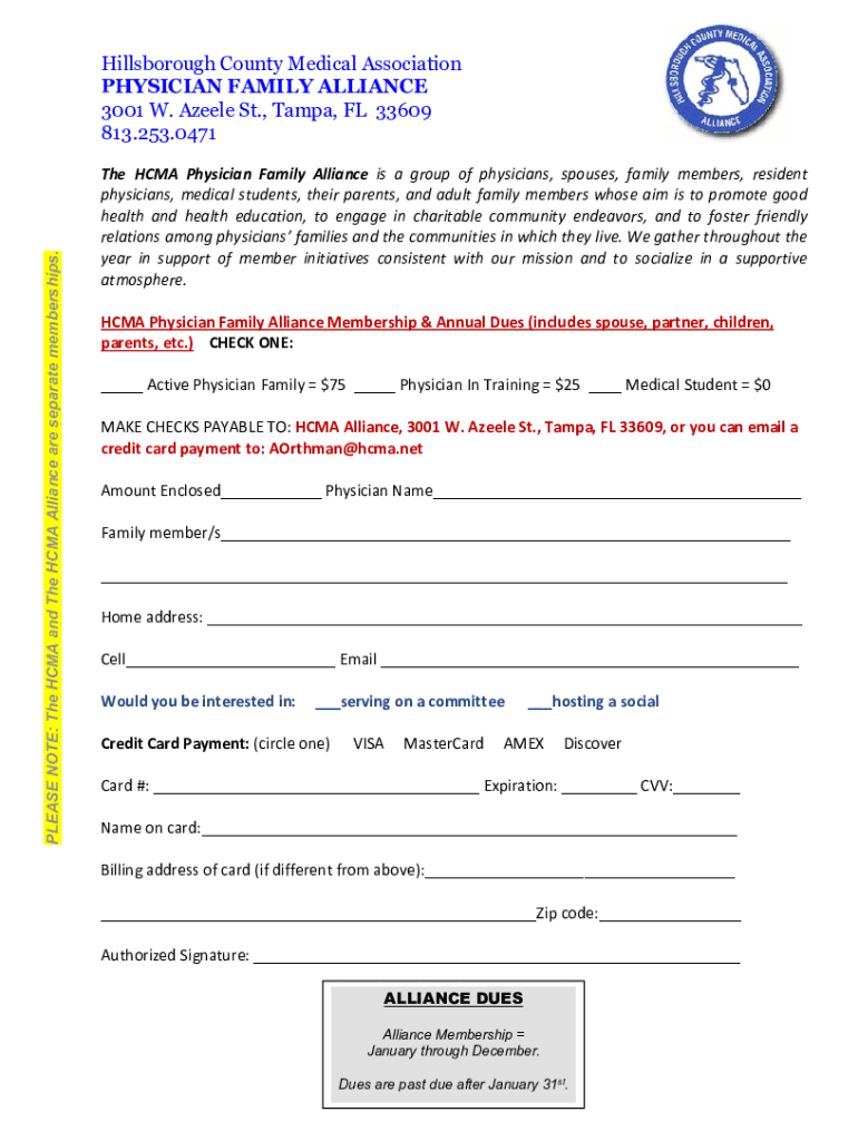 PLEASE NOTE: The CMA and The CMA Alliance are separate memberships. Hillsborough County Medical Association PHYSICIAN FAMILY ALLIANCE 3001 W. Steele St., Tampa, FL 33609 813.253.0471 The CMA Physician